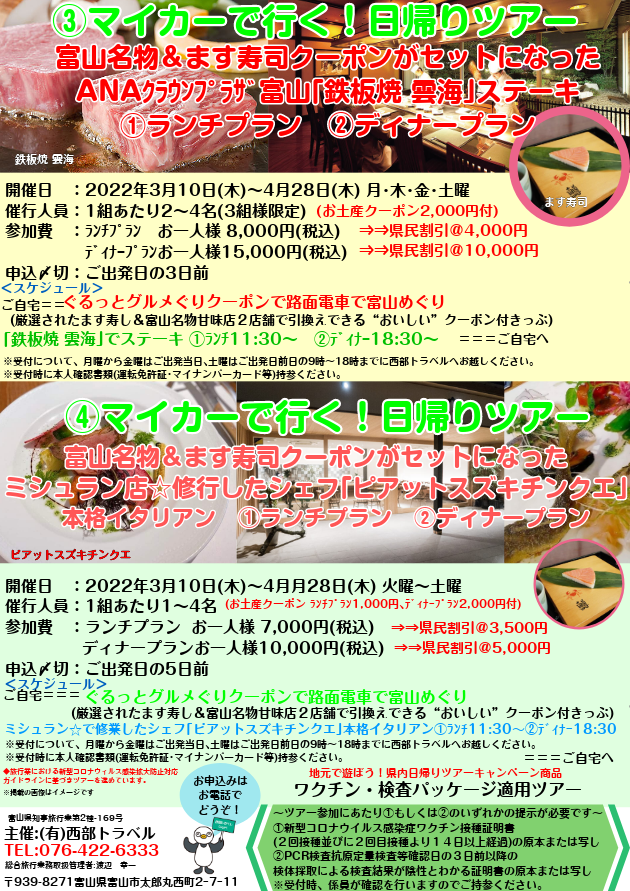 マイカーで行く!日帰りツアー①~⑥発売開始 2022/3/10~4/28