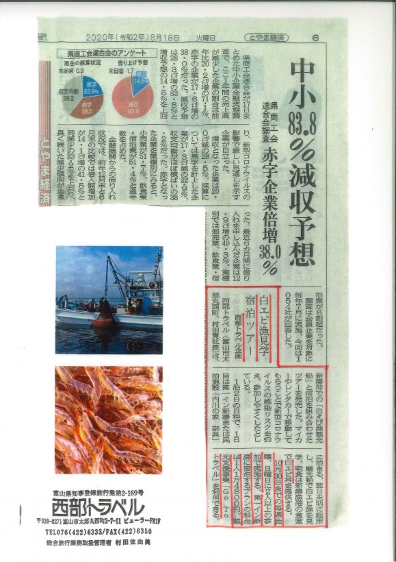 北日本新聞2020年8月18日「白えび漁見学宿泊ツアー」