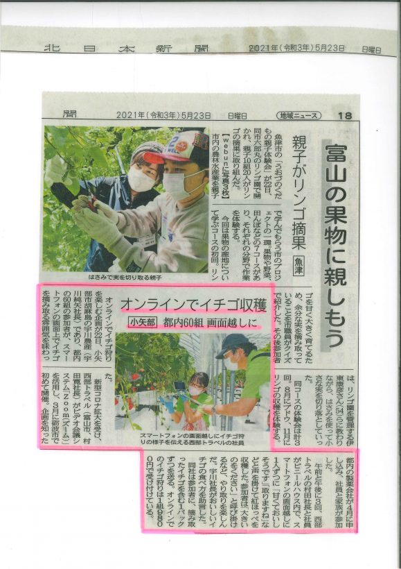 北日本新聞2021年5月23日「オンラインでイチゴ収穫」