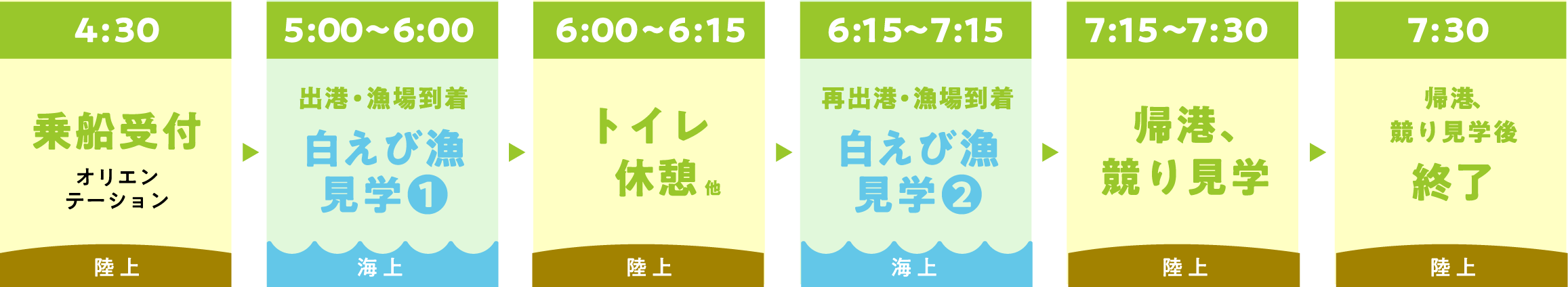 | 6:30 | 白エビ漁見学❷ 網引き揚げ&水揚げ作業の見学 |