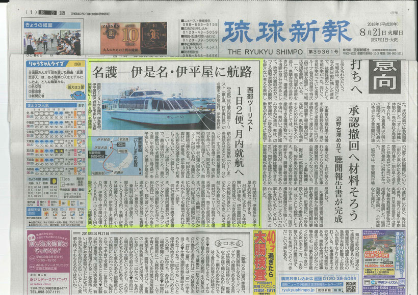 琉球新報 ・沖縄タイムス 2018年8月21日「名護~伊是名・伊平屋に新航路」