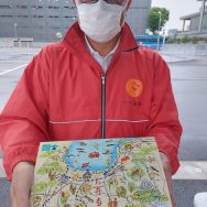 わが社の代表もカニとブリの被り物でお出迎えです(*’▽’)